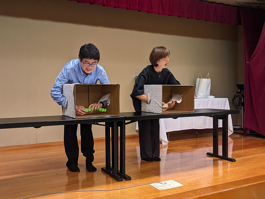 たわし・スライム・水中メガネなど様々な物を入れてトーナメント戦をし、1.2位の社員には、豪華賞品が贈呈されました。
