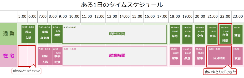 在宅になってからは、7時に起床し入浴、8時半から支度をし、私の勤務時間の9時半にタイムカードを打刻するという流れです。朝の余裕ができたことで、心にもゆとりがうまれ、通勤にかかっていた時間を家族や自分の時間に使えるようになりました。