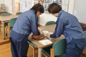 毎年社内の食堂で行われるお正月行事の鏡開き。当日は食堂から小豆を炊く甘い香りが漂ってきました。今年の準備を進めてくれたのは、WさんとKさん。協力して準備を進める様子は、「今年も始まったなぁ」と、実感させてくれます。